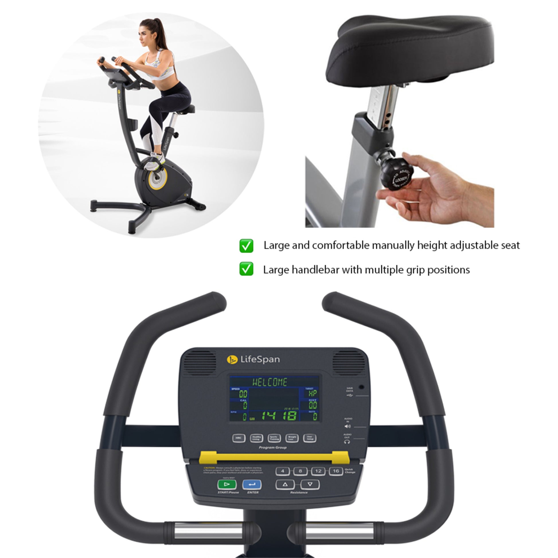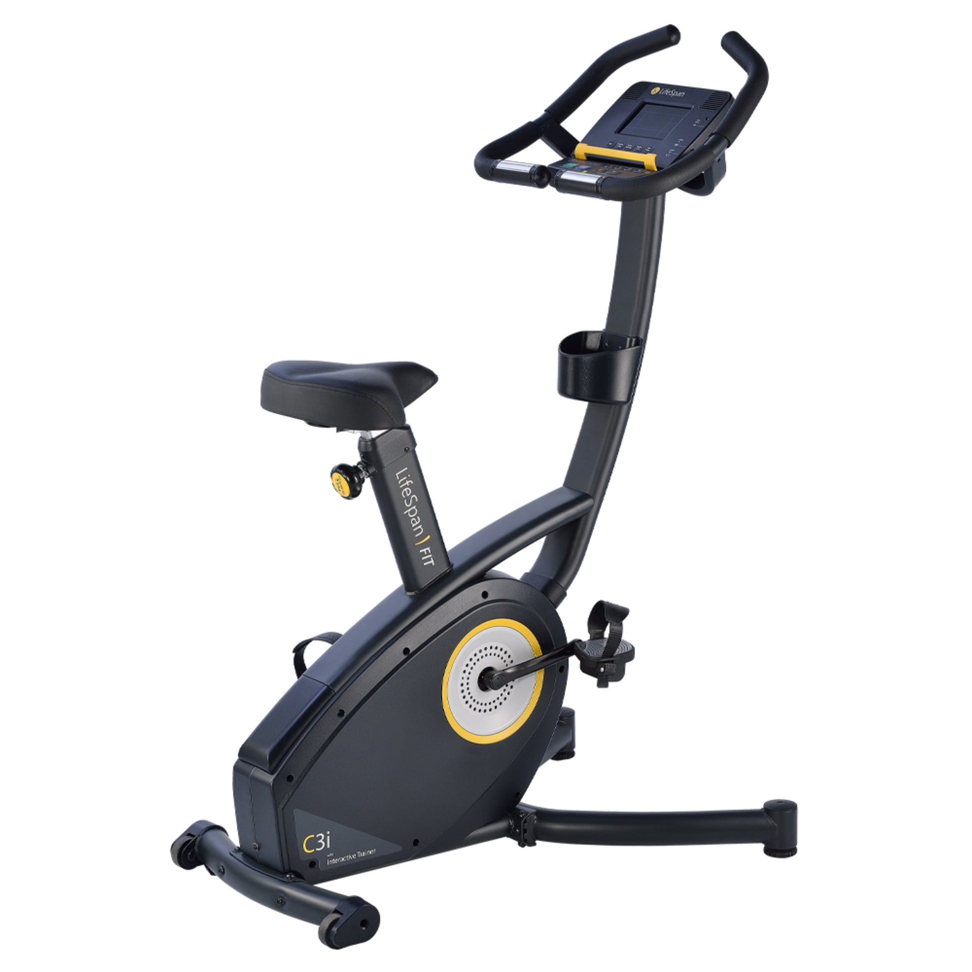 Vélo d'appartement LifeSpan Fitness C3i pour un entraînement intensif à domicile, équipé d'un écran LCD, d'un support pour tablette et smartphone, d'un porte-bouteille, de haut-parleurs intégrés, d'entrées audio pour iPod et casque, et d'une selle réglable en hauteur. Le cardiofréquencemètre LifeSpan avec ceinture thoracique est inclus.