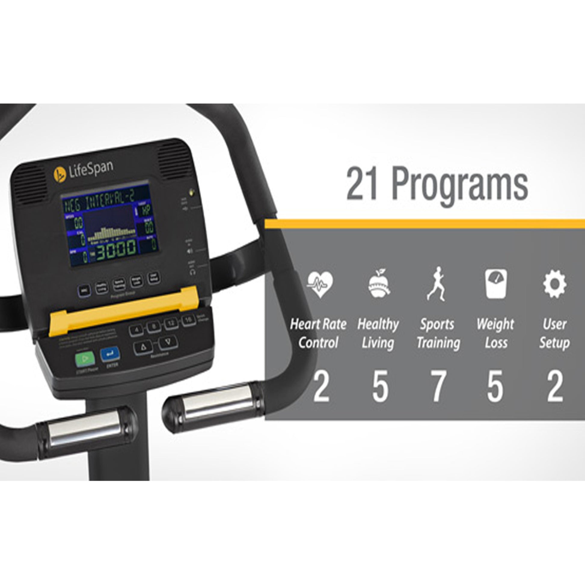 | Programmes d'exercices | 2 programmes de fréquence cardiaque, 2 programmes utilisateur personnalisés et 17 programmes prédéfinis (5 programmes de gestion du poids, 5 programmes « Vie saine », 7 programmes d'entraînement sportif) |